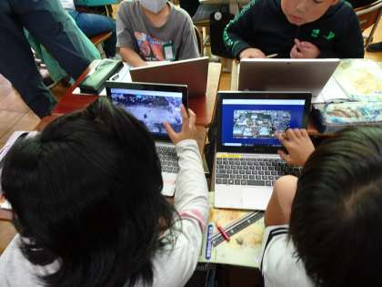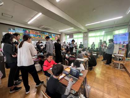 3年生が、社会科「京都市の様子とくらしのうつりかわり」の学習をしています。今日の5時間目は、先生がたくさん教室に見に来ています。先生の多さに、3年生もはじめは驚いているようでしたが、授業が始まると、いつも通りGIGA端末も使って、一生懸命に話し合ったり発表したりできていました。
