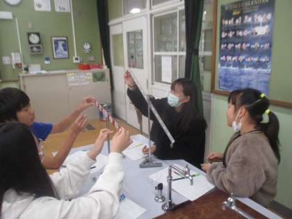 実験用てこにおもりをつるして、うでのかたむきを調べました。