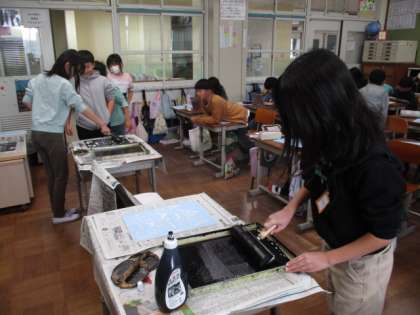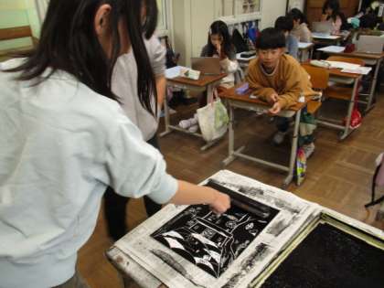 2学期に彫った版画を刷っています。