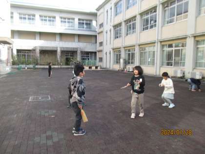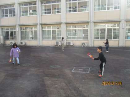 生活科の「ふゆとともだち」の学習の1つとして、お正月の遊びである「羽子板」や「だるま落とし」などで遊びました。初めて経験する子も多く、「難しい!」と言う子がたくさんいましたが、だんだんとできるようになってくると、「もっとやりたい!」「休み時間にもやりたい!」とお話ししてくれました。
