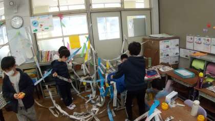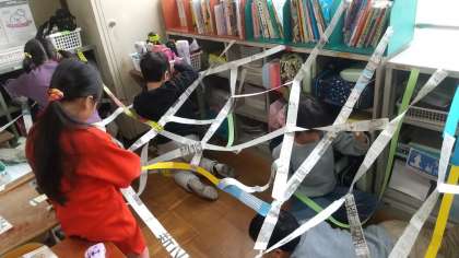 新聞紙や画用紙などをたくさんつないで、楽しい世界を作りました。「くもの巣ワールドみたい!」「滝みたいになってるところもあって楽しい!」と、みんな夢中に紙をつないでいました。