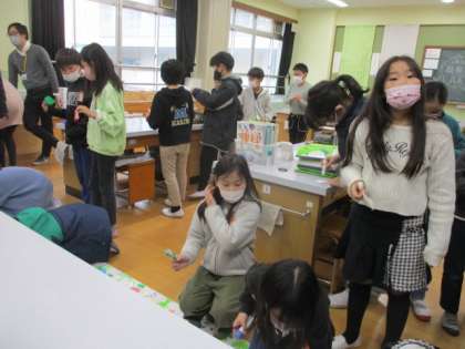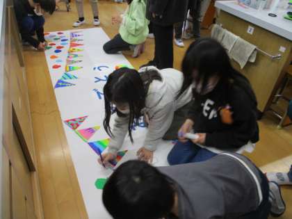 6年生に「おめでとう」の気持ちを伝えるために、飾りをつくりました。
