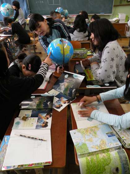 地球儀を使って,陸地と海の広さを確認したりどのような地形になっているのかを調べたりしました。