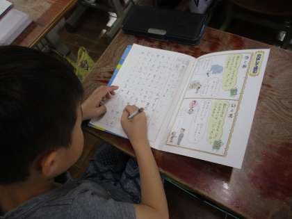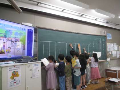 国語で「絵を見てかこう」という学習をしました。絵を見て,「どこで」「だれが」「なにをしているか」という視点で文章に表しました。絵の細かい様子までじっくりと見て長い文章に表している子がたくさんいました。
