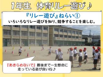 1年生の体育学習では、「かけっこ・リレーあそび」を行っています。「リレーあそび」の学習では、いろいろなリレーあそびの行い方を知り、リレーあそびに進んで取り組んだり、勝敗を受け入れたりして、運動を楽しむことが大切です。