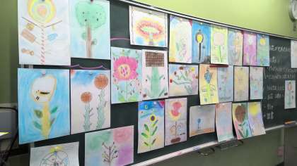 図画工作の学習では、「こんなお花があったらいいな」という思いで、自分だけの世界に一つのお花を描きました。