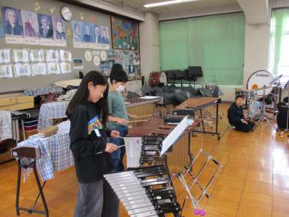 写真は鍵盤ハーモニカ、木琴、鉄琴、指揮者の練習風景です。