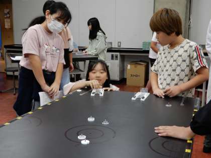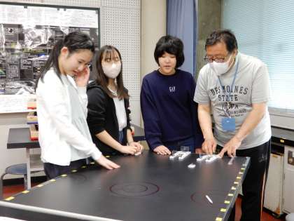 実際にビリヤードの遊びをしてから、カーリングの仕組みを使って何度も実験をしました。ばねを引く力とおはじきの重さの組み合わせを変えて、弾く力の強さがどう変わるかを調べていました。
