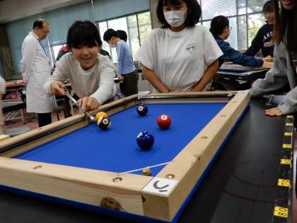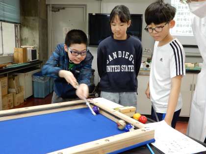 最後にビリヤードの遊びに戻って、学んだ弾く力の強さを生かして、チーム戦をしました。ばねを引く力と、球を打つ角度を考えながら、楽しんでプレーできました。