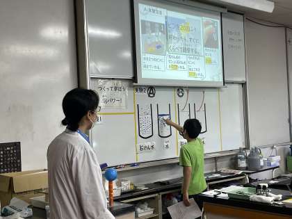 実際に石鹸水を入れたものと入れなかったものの2種類の試験官に汚れとなる油をしみこませた毛糸を入れて20回ほど振り、毛糸の様子がどうなったのか実験していました。