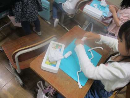 図工の「にぎにぎねん土」の学習の様子です。にぎってできた形から、なにができるなかと想像しました。「すべりだい」「うさぎ」「ぎょうざ」「えだまめ」などいろいろなものに変身しました。他にも「のばす」「たたく」「つまみ出す」「おす」など工夫していました。
