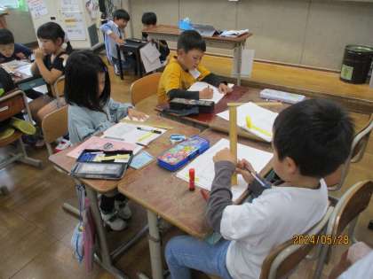 計った長さを友だちと交流しました。たくさん計ったものをお互い紹介しながら同じ長さを共感していました。