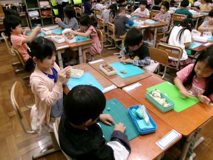 自分の好きなものを粘土で作りました。今までに学習したねじる、丸める、細くするなどの技を生かして作っていました。