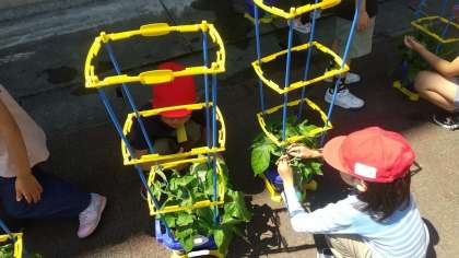 みんなで考えて支柱を立てに行きました。