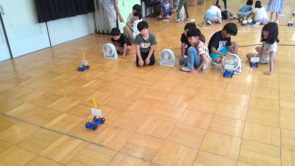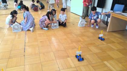 理科の学習では、「風の強さのちがいで、車の動くきょりは変わるのか」実験をして確かめました。風で動く車の様子を一生懸命見ていました。