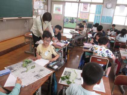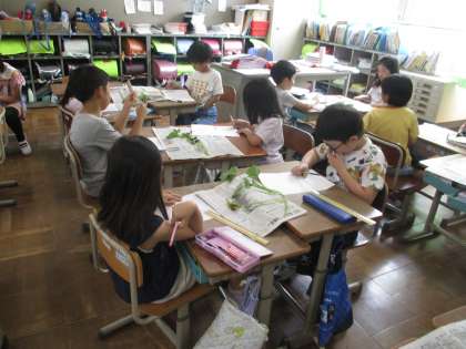 少し前のことになりますが、サツマイモの苗を観察しました。色は?形は?においは?などくわしく観察し、観察したことをカードに書きました。
