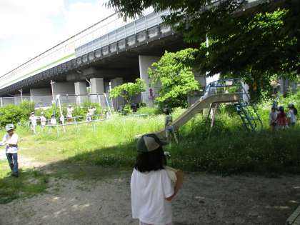 生活科の学習で、「「すてきだな」「気になるな」という所を見つける」という目的で深草の町を探検しました。道中、ツバメの巣を発見すると、みんな「かわいい〜!」と釘付けでした。この日は学校の近くの公園にも行き、そこで遊びました。