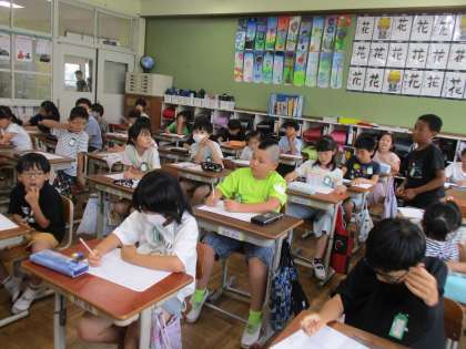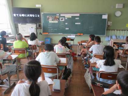 栄養教諭の先生に『京野菜の賀茂なす』についてお話をしていただきました。その中で生産者がどんな思いで賀茂なすを作っているのか考えることができました。学習の最後には「食べてみたい!」という声が聞こえてきました。