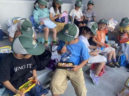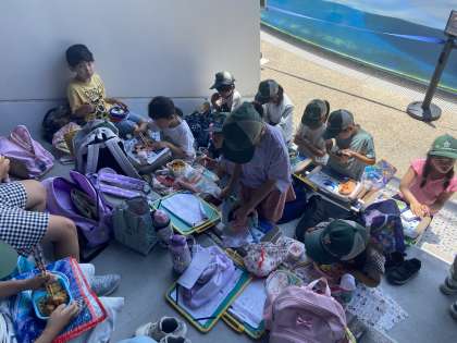 待ちに待ったお弁当の時間です。みんなお弁当の時間が1番嬉しそうで楽しそうでした。外の気温が高かったので、梅小路公園で食べずにイルカスタジアムで食べました。
