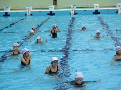 2年生では「浮く」「もぐる」をめあてにしています。水中じゃんけんをしたり碁石拾いをしながら楽しんで学習しています。