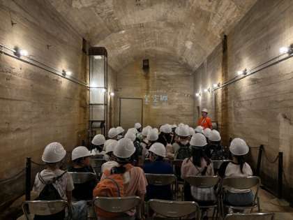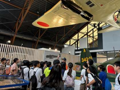 加西市にある「鶉野飛行場跡」に到着しました。ボランティアガイドさんに説明をしてもらいながら、防空壕やsoraさかい(鶉野ミュージアム)の館内をクラスごとに見学しています。