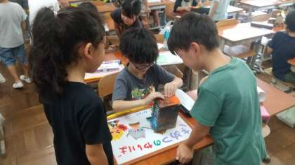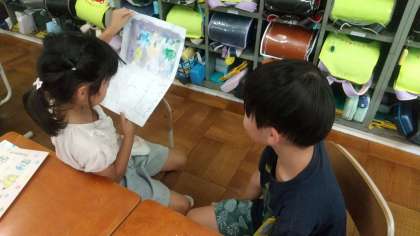 久しぶりの学校に緊張していた子もいましたが、夏休みの間に作った作品を見せ合いっこしたり、夏休みの絵日記を見せて喋ったりするうちに、だんだん気持ちもほぐれてきたように見えました。