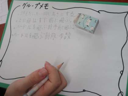 ハードル走は今年から初めて取り組んでいます。コツやポイントを班で共有し、フリースペースにメモすることで、毎時間確認して取り組むことができます。全員で学び合い、高め合いをしていきましょう!