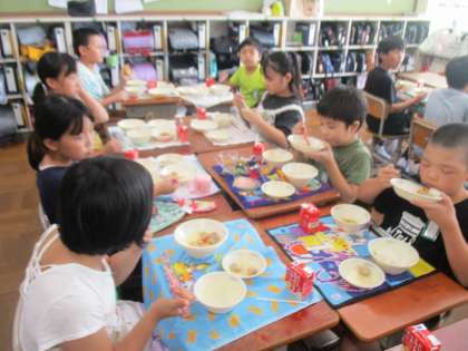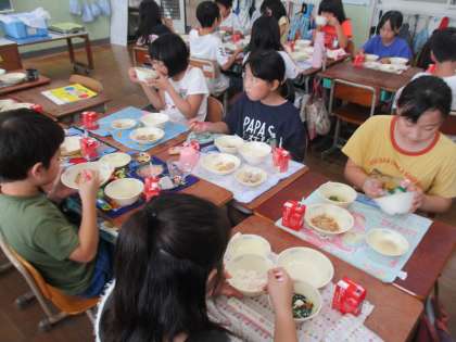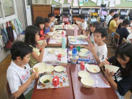 友だちと 『なごみこんだて』を楽しみながら食べました。中秋の名月に合わせ、里芋や五色のすまし汁をいただきました。だしの味がよく出ていて美味しいと言いながら食べていました。