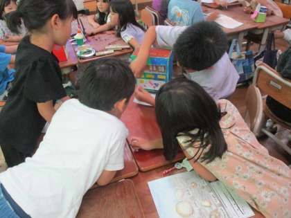 夏休み明けに、自由課題の紹介をしました。絵・うごくおもちゃ・貯金箱・縫物など様々な作品がありました。「こうやって作ったよ。」「中はこうなっているよ。」「こうすると、出てくるよ。」などと、作品の紹介をしていました。どれも素敵な作品でした!!