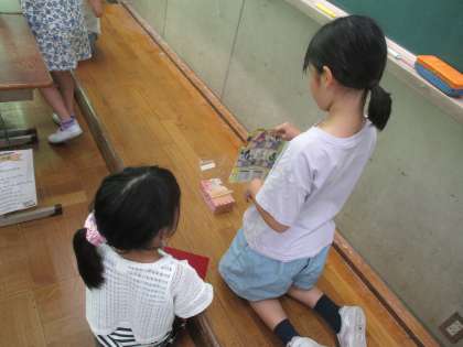 生活科でうごくおもちゃを作っています。ゴムや風の力で動くおもちゃを作って、うまく動くか実験中です。どうしたらもっと速くうごくかな、高くとぶかなと考えながら作っています。