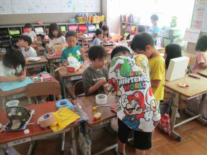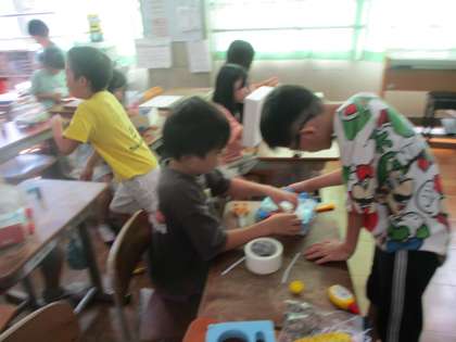 うごくおもちゃで車を作りました。タイヤが動くように、子どもたち同士で「こうするといいんじゃないかな。」とアドバイスし合っていました。同じ仕組みの車を作っても、羽をつけたり風で動くようにしたりといろいろな作品ができました。友だちと交流すると、新しい発見がありますね。