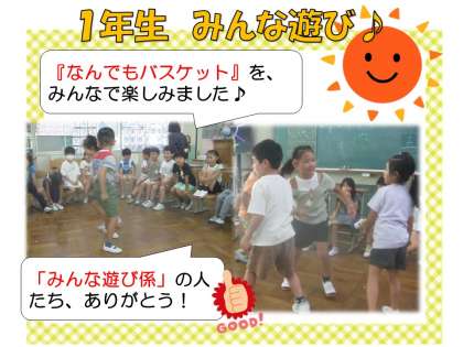 9月に入ったというのに暑い日が続くこの日も、「暑さ指数のため、休み時間は運動場で遊べません。」という日だったのですが、みんな遊び係の提案で、室内でできる「フルーツバスケット」を楽しみました。係の担当の子たちが、「例えば…、いま黒い服を着ている人?という風に言ったら、その人はイスから立ってちがうところに座ります。」と説明してくれ、みんなでゲームをスタート。