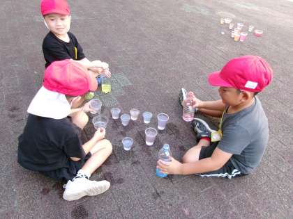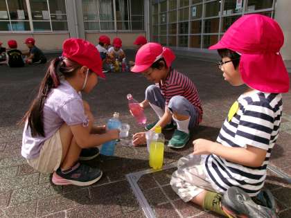 絵の具とペットボトルを使って色水をつくりました。最初は赤・黄・青の3色のペットボトルに入った水が、混ぜて入れると色々な色に変わりました。色同士をどんどん混ぜてカラフルな色水を作っていました。