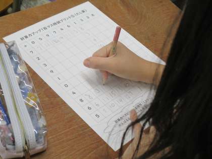 100マス計算を真剣に取り組んでいます。四則計算は算数のあらゆる場面で出てきます。簡単な問題ではありますが、素早く正確にをテーマに頑張っています。これからもどんどん力を伸ばしてほしいと思います。