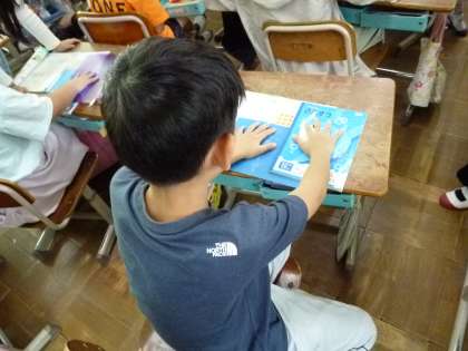 算数の学習ではかけ算を学習しています。今日は、かけ算の表を使いながら6のだんの九九をつくりました。だんだんいくつずつ増えていくかなどわかるようになってきて、6のだんともなると「6ずつあがるんじゃないかな」と言いながら表を使って確かめていました。