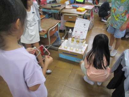 おもちゃフェスティバルに向けて、クラスの友達と遊びあって、おもちゃの確認をしているところです。1年生にどのように遊び方を説明するか、お店での役割分担は、こわれないように丈夫にしないと…などたくさん考えました。