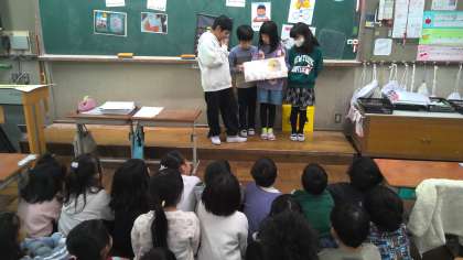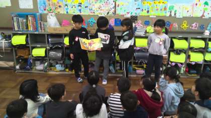 国語の学習で、1年生におすすめの一さつを班で決めました。決まった本を、1年生に読み聞かせしました。登場人物になりきって読んでいました。