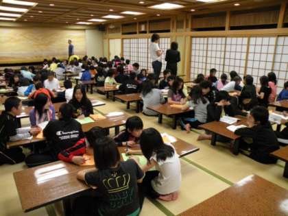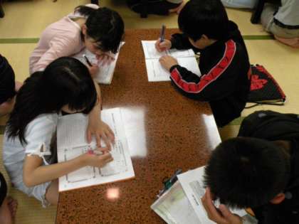一日の振り返りについて、しおりにまとめています。平和記念公園や資料館での見学を体全体で感じた子どもたちが多くいました。