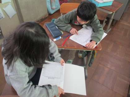 算数の授業の様子です。かけ算の表に九九を書き込んで、答えが合っているか確認しているところです。ペアの友だちと九九を声に出しながら、確認していました。