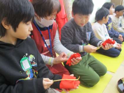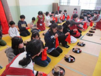 最初に「帛紗」の使い方を教わりました。きれいに折りたたむことが難しく苦戦していましたが、丁寧に教えていただいたおかげもあり、みんなが上手に出来ていました。