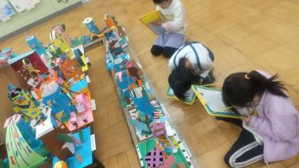 1年生にとって初めての作品展。全学年の作品が飾られているのを見て、「わあ!すごい!」の声が上がりました。