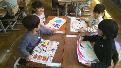 昨日、図画工作の時間にかいた絵を、お友達と見せ合いっこしました。「これは何をかいたの?」「この色すてきだね。」など、お友達の絵を見て気づいたことや、いいところを伝え合いました。