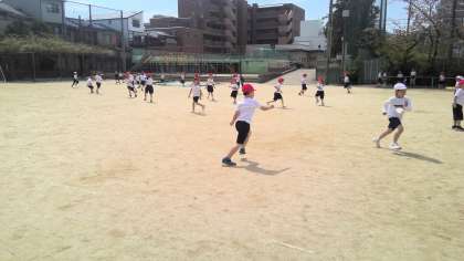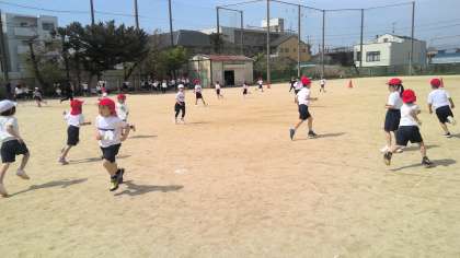 体育の学習で、運動場を探検しました。入ってはいけない所、気を付ける所など確認をしました。そのあと、鬼ごっこをして思いっきり走りました。安全に気を付けながら元気に活動できました。