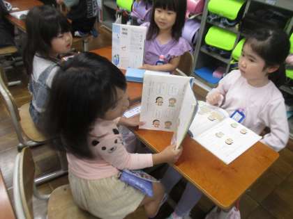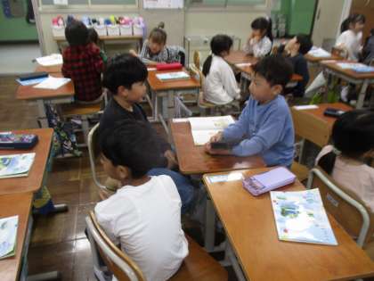 友だちとお話のテーマに沿って話し合い活動をしています。本日のテーマは「好きなあそび」「好きなアニメ」でした。「〇〇さん、好きな××を教えてください」「僕は・・・です。」の話し方をもとに、思ったことや感じたことをたずねあって話を進めていきました。大盛り上がりの様子で、もっとしたい!という子が何人もいました。
