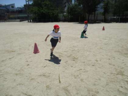 リレーあそびの1回目の学習でした。1度各チームで対戦をし、その後どうすればもっと速く走ることができるのかを話し合いました。「腕をしっかりと振る」「足を上げる」「コーンを回るときは姿勢を低くする」など、たくさんの意見が出ました。最後の対戦では、1回目に走った時よりも随分早くなることができました。次はもっともっと速くなるコツを探したいですね。