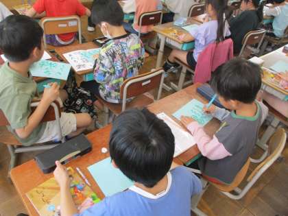 書写の時間に水筆の練習をしました。ふでをすべらせると、シートの色が変わるので、「すごーい!」と歓声が上がっていました。筆の持ち方に気をつけながら、線を描くのを楽しみました。