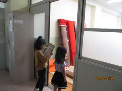 生活の学習で,学校探検に行きました。二年生と一年生が一緒のグループになり,皆で仲良く学校を探検して,いろいろなお部屋を見に行きました。日頃,見ることができない部屋の中も特別に見ることができ,子どもたちは興味津々でした。