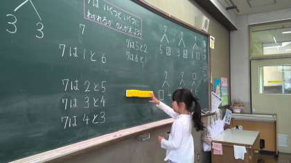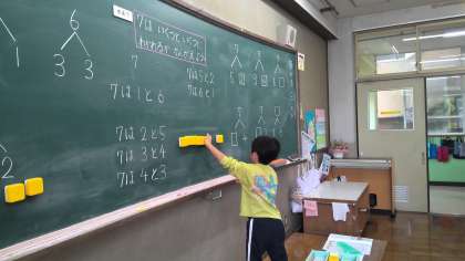 算数の学習では、7はいくつといくつになるのか調べました。すうずブロックを使って、考えることができました。