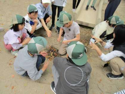 2枚目の写真は、「焚火ごっこ」の様子です。みんなで歌も歌いました。