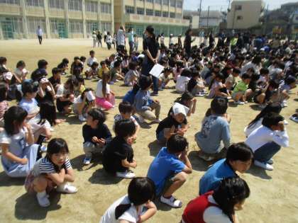 小学校ではじめて避難訓練に挑みました。「おはしもて」をもとに静かに避難することもできました。すごい。